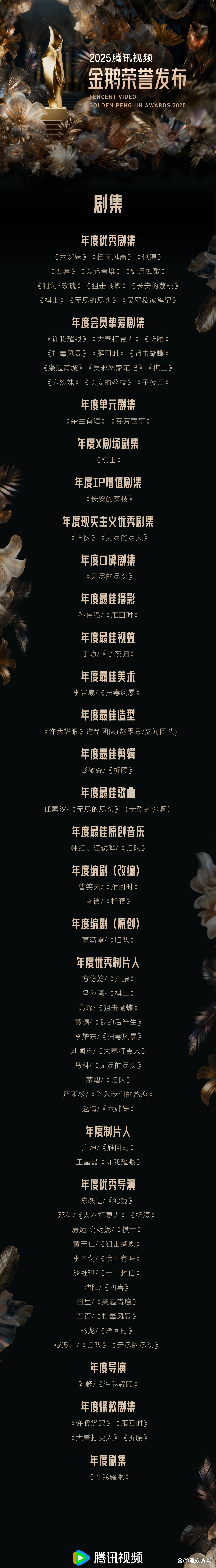 其他高光獎項:- 年度優(yōu)秀劇集(12部):《六姊妹》《掃毒風(fēng)暴》《狙擊蝴蝶》《梟起青壤》等上榜,迪麗熱巴憑《梟起青壤》《利劍·玫瑰》雙劇入圍;- 技術(shù)類獎項:《雁回時》獲最佳攝影(孫偉強)、《子夜歸》獲最佳視效(丁崢)、《折腰》獲最佳剪輯(彭敬森)。