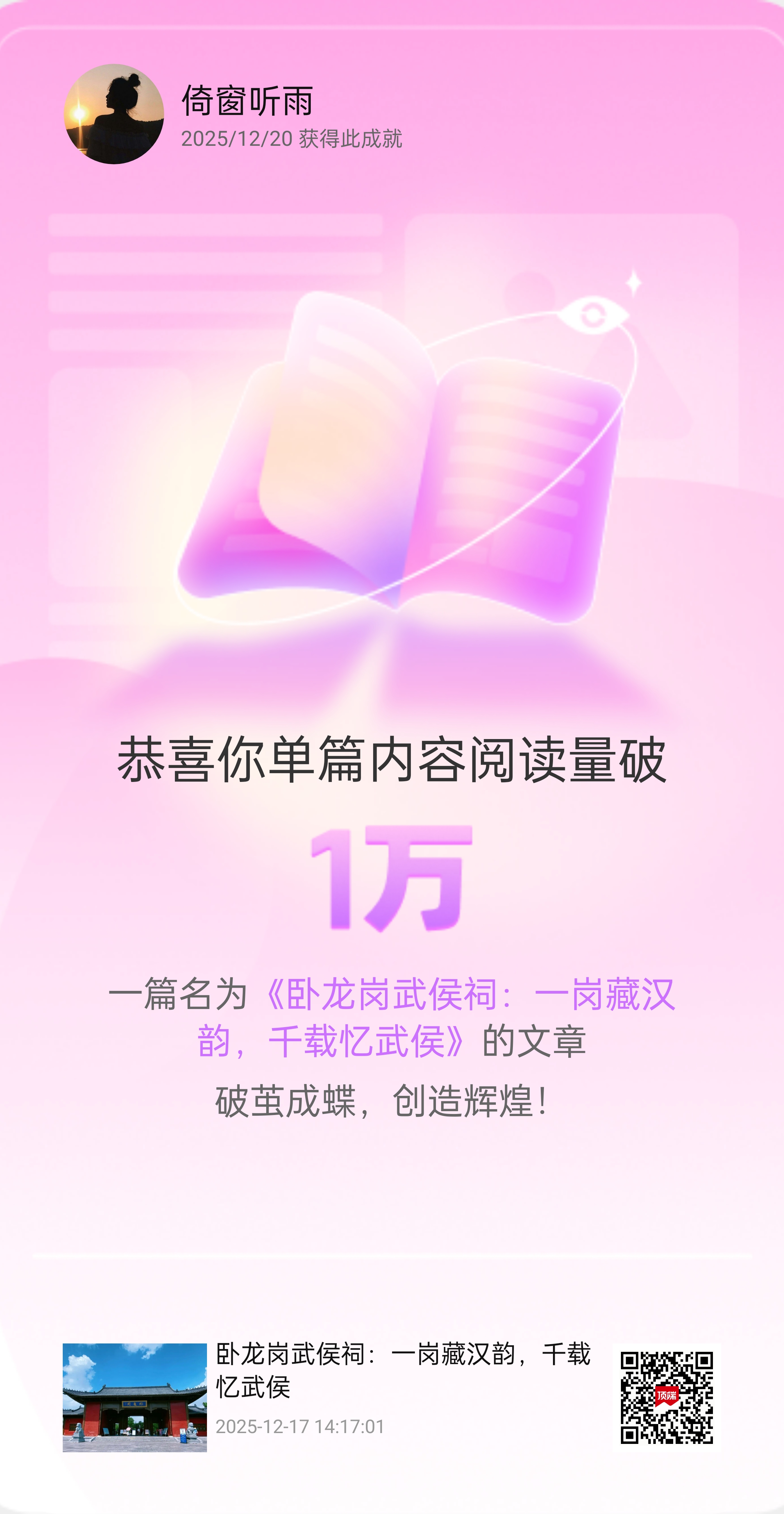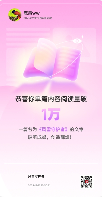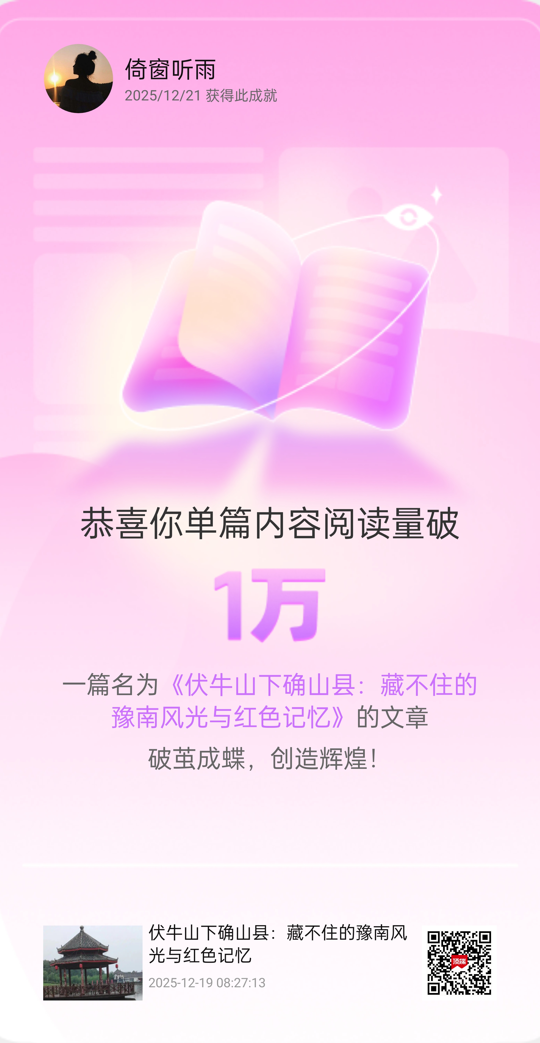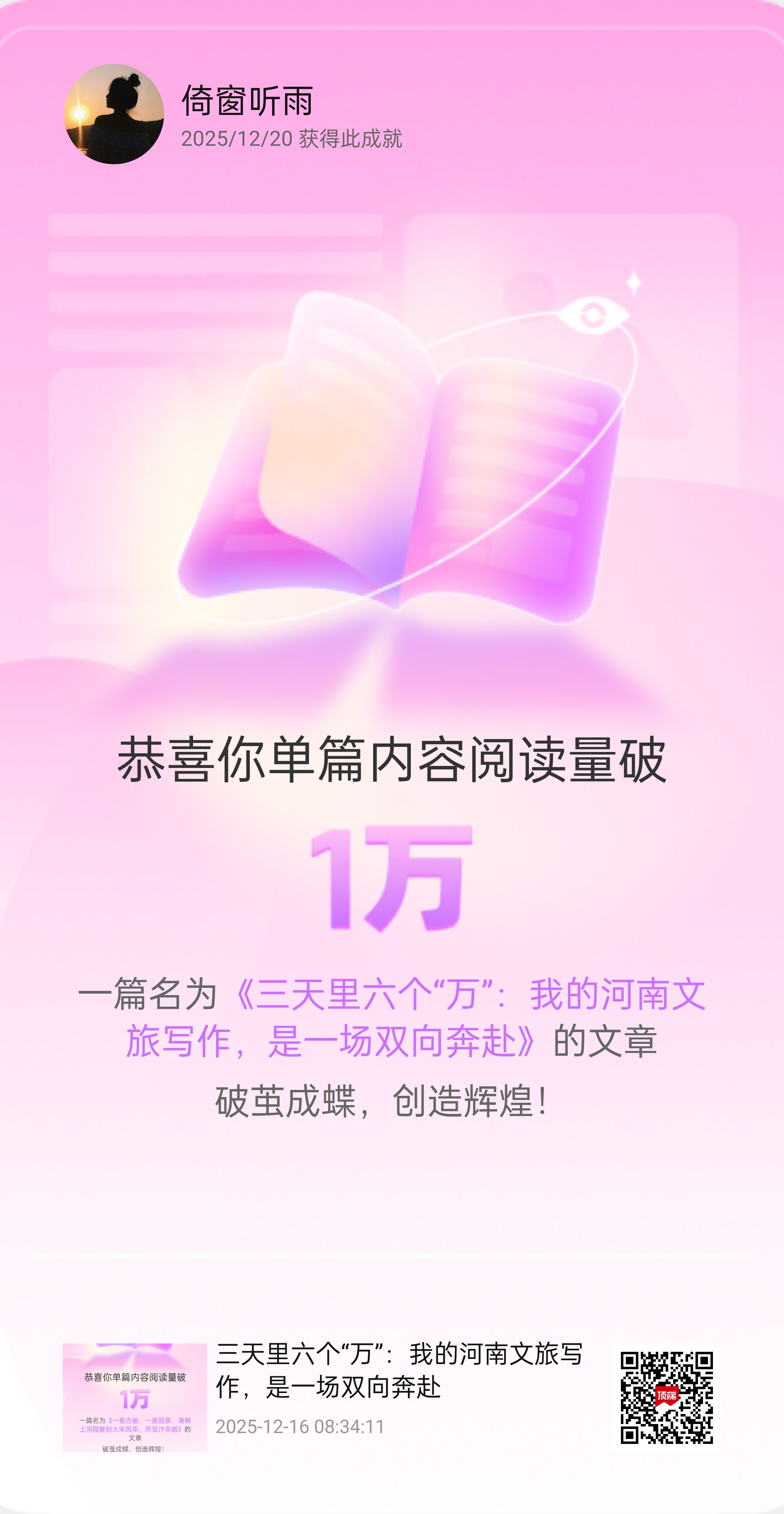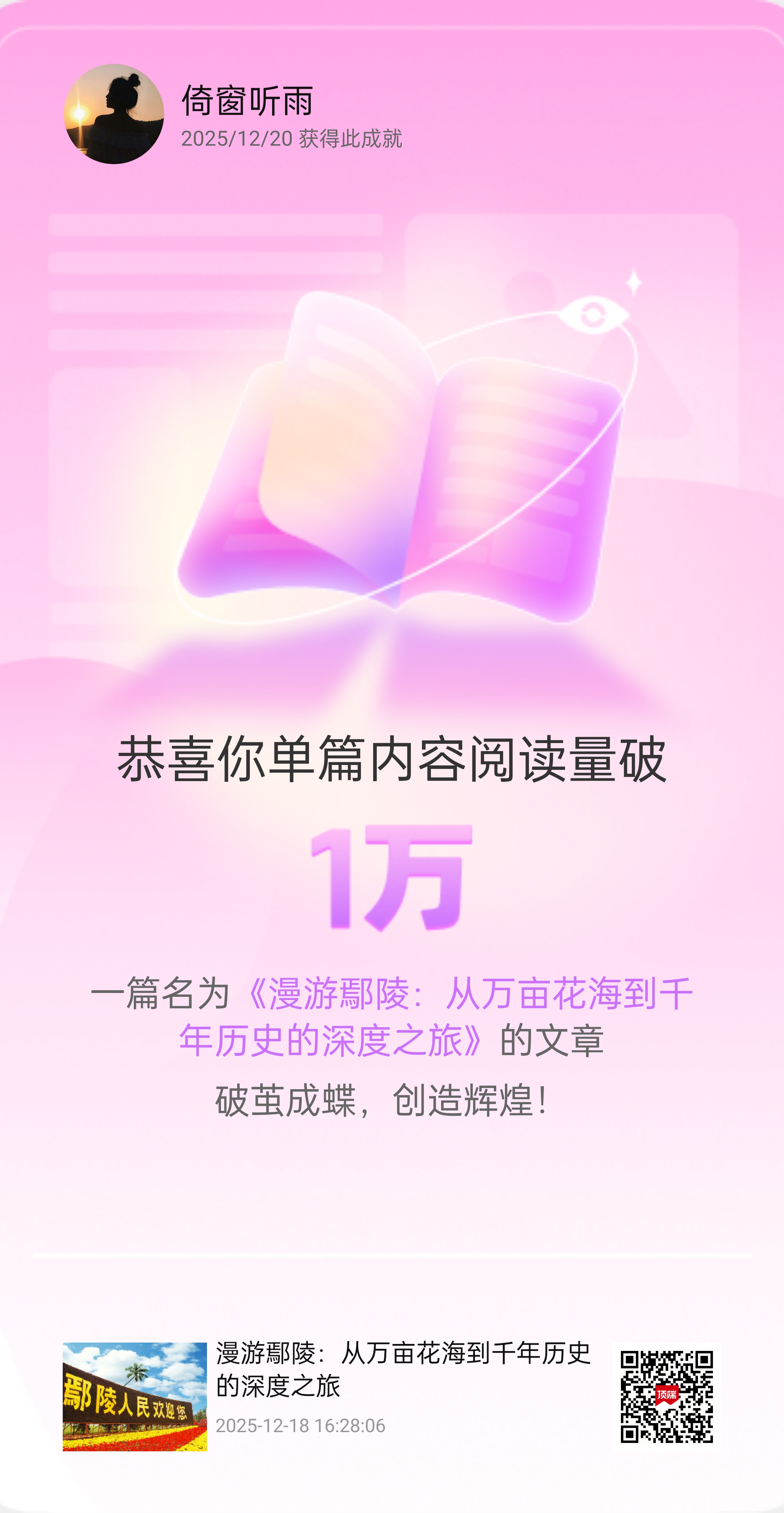 今天手機里彈出的“破萬”提示,像一串輕盈的風鈴,叮叮當當地撞進了我的日常——算上剛出爐的,短短幾天里,已經有7篇文字邁過了“1萬閱讀”的門檻。
