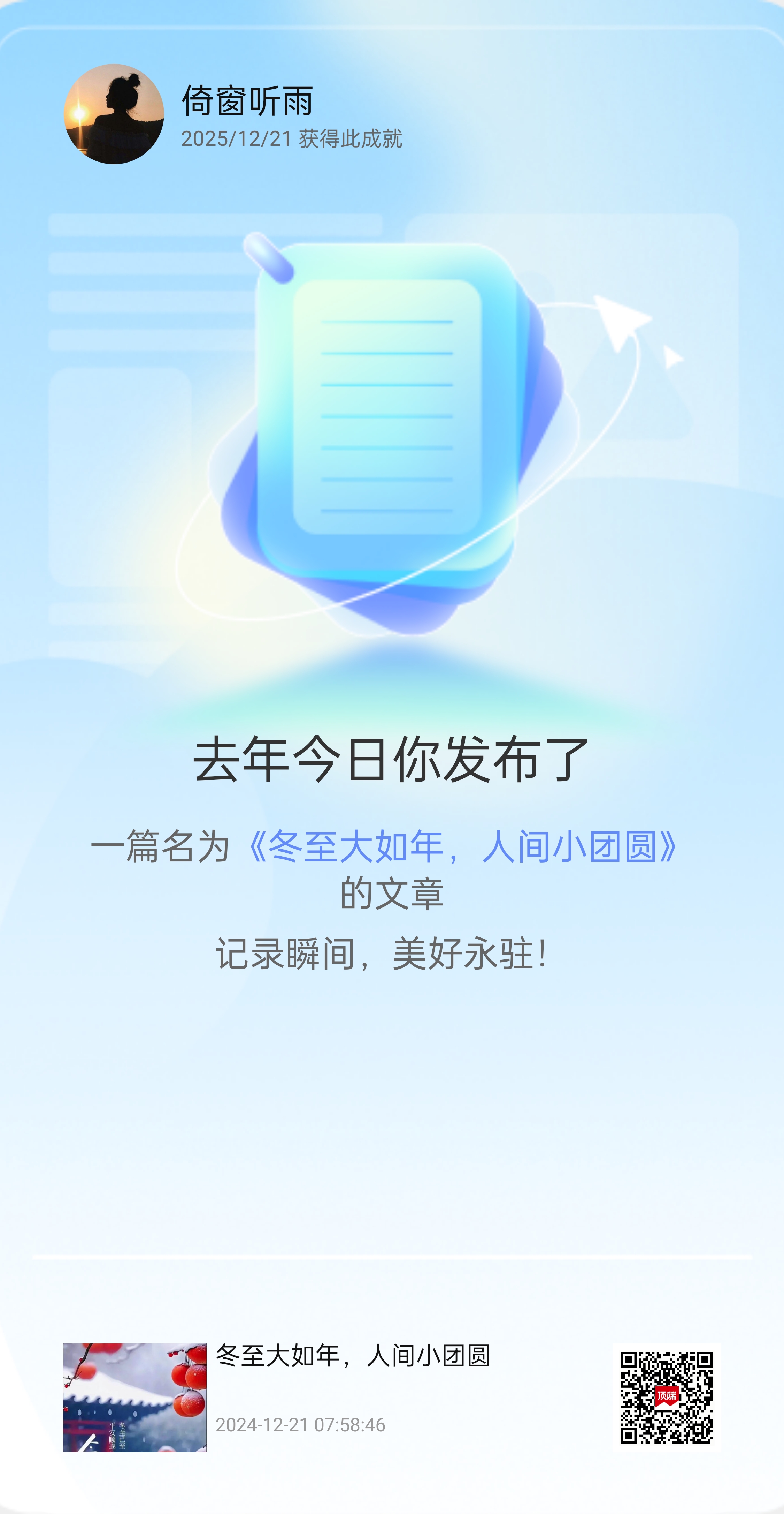就像今天彈出的“去年今日”,去年冬至寫的《冬到大如年》,如今又被系統撈了出來——原來那些認真寫下的字,真的會像種子一樣,在時光里悄悄扎根,等某個時刻,再輕輕晃醒一段共鳴。