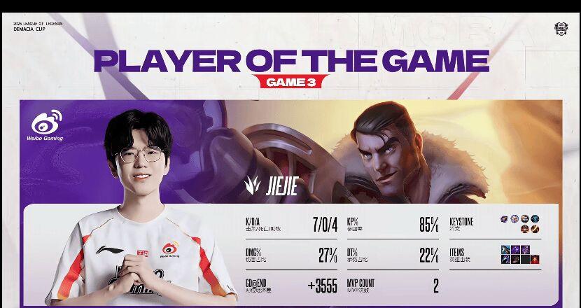 中期團戰成為Jiejie的個人秀,他的杰斯利用炮形態遠程消耗頻繁壓低JDG血線,近戰形態的切入更是屢次撕裂陣型。第22分鐘的關鍵團戰中,小虎的發條大招拉中三人,Jiejie杰斯跟進完成收割,WBG打出0換3并拿下厄塔汗。最終,WBG憑借大龍Buff一波結束比賽,Jiejie以7/0/4的完美數據再奪MVP。