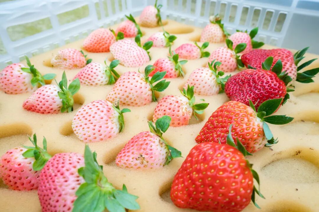品種方面,“紅顏”“章姬”這兩位“老熟人”依舊是頂流,2024~2025年度占了全市種植面積的95%,畢竟誰能拒絕它們的香甜呢~近年來,上海科研院校和滬郊有的合作社都開始自主培育、引進各種不同顏色、不同成熟時期的優質草莓品種,如上海交通大學培育了“嬌美一號”“雪寶”,寶山羅涇鎮的自然草莓園也培育和引進了不少口感獨特的特色草莓品種。