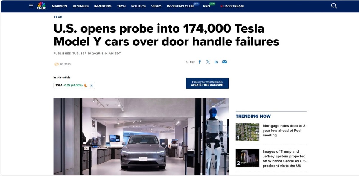 特斯拉作為隱藏式門把手的引領者,一直堅持這一設計,直到2025年9月因隱藏式門把手安全隱患被美國監(jiān)管部門調(diào)查。