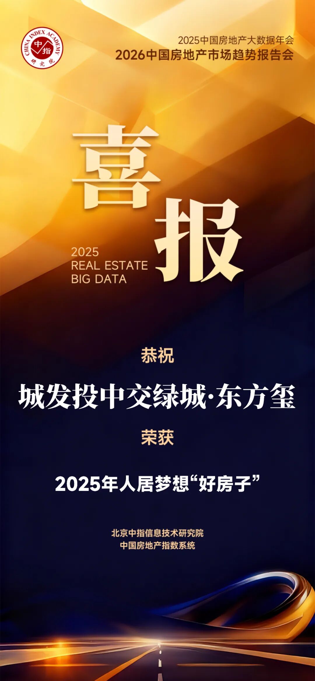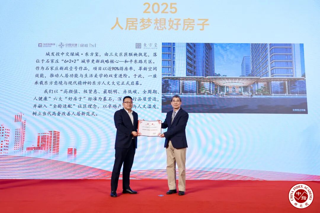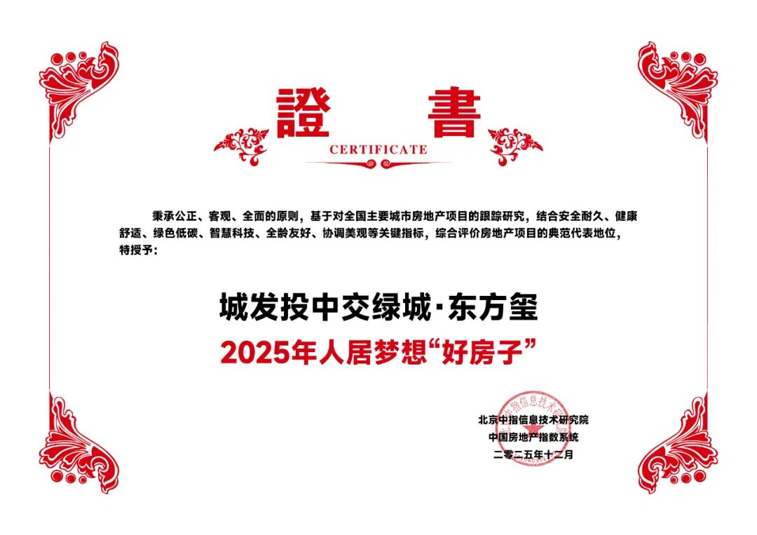 2025年,為進一步促進房地產行業高質量發展,中指研究院啟動2025年人居夢想“好房子”研究與優選工作,最終在全國范圍內優選出70個『2025年人居夢想“好房子”』項目。作為石家莊“新政壹號作品”,城發投中交綠城·東方璽憑借硬核產品力與東方人文底蘊,在全國眾多項目中脫穎而出,榮膺『2025年人居夢想“好房子”』。