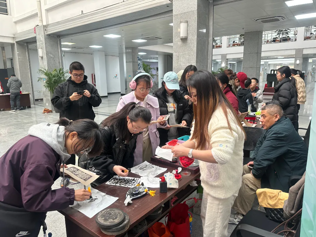 非遺拓印體驗極具亮點,我們特別攜帶“十二生肖”“四大神獸”等主題瓦當及多款銅鏡復制品作為拓印載體,工作人員現場示范拓印技巧,從宣紙鋪展、墨汁調和到拓包按壓的力度把控,一步步耐心引導學生親手完成拓片制作,讓學子在動手過程中直觀感受傳統工藝的溫度與魅力。