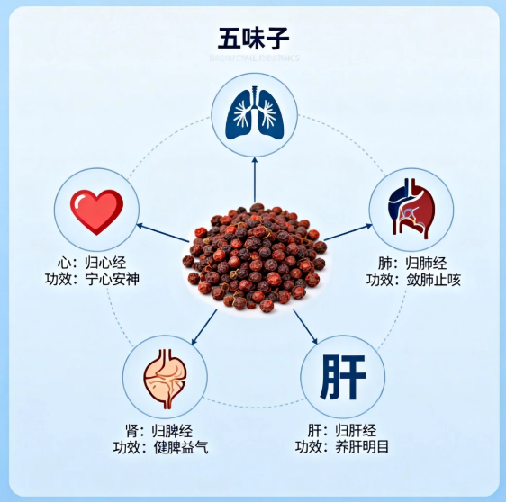五味子性溫,味酸甘,歸肺、心、腎經。其核心功效是 “收斂固澀,益氣生津,補腎寧心” 。