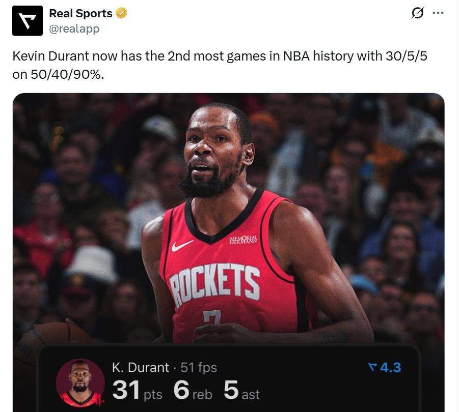 憑借這樣的表現,杜蘭特以180俱樂部(三項命中率為50/40/90%)砍下至少30+5+5的場數來到54場,成功追平伯德并列NBA歷史第二,僅次于庫里的61次。