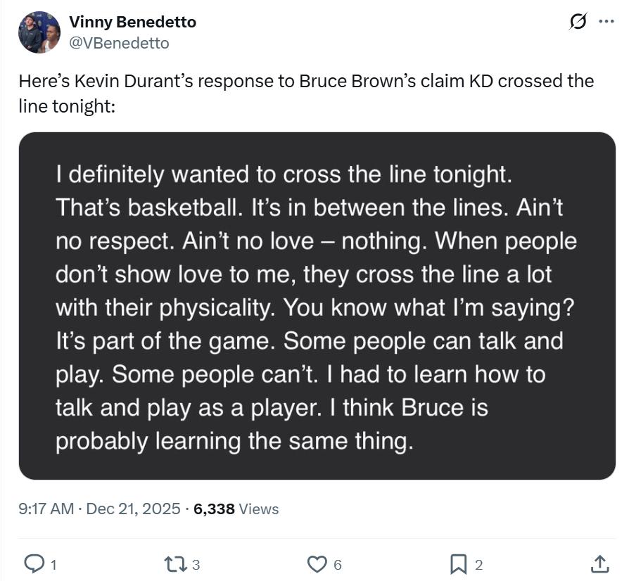 面對布朗這樣的說法,“鍵盤大師”杜蘭特賽后自然也迅速給出回應。