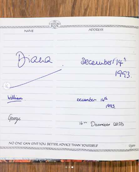 而翻開(kāi)前頁(yè),上面正是他父親威廉王子1993年稚嫩的筆跡,以及祖母戴安娜王妃優(yōu)雅的簽名。