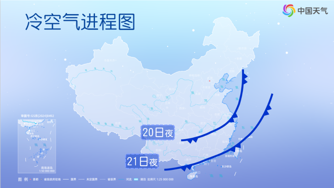 緊接著,22日,還會(huì)有新一輪冷空氣上線,自西北地區(qū)開始影響我國;23日以后中東部地區(qū)又將自北向南出現(xiàn)顯著降溫。