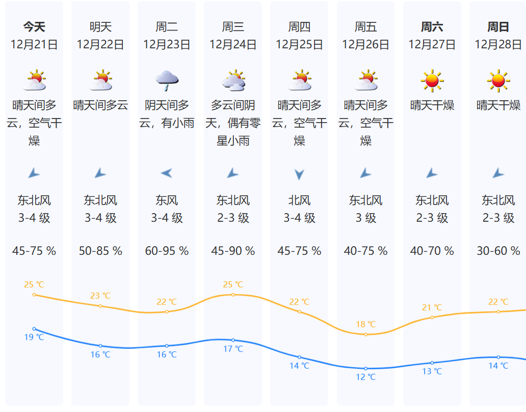 22日晴天間多云;23日云量較多,有小雨,沿海、高地最大陣風(fēng)7級(jí)左右;24日多云為主,氣溫回升;25日起新一股冷空氣影響,氣溫下降。