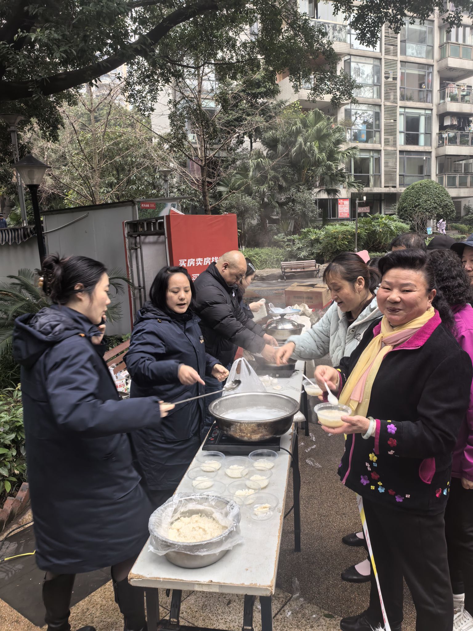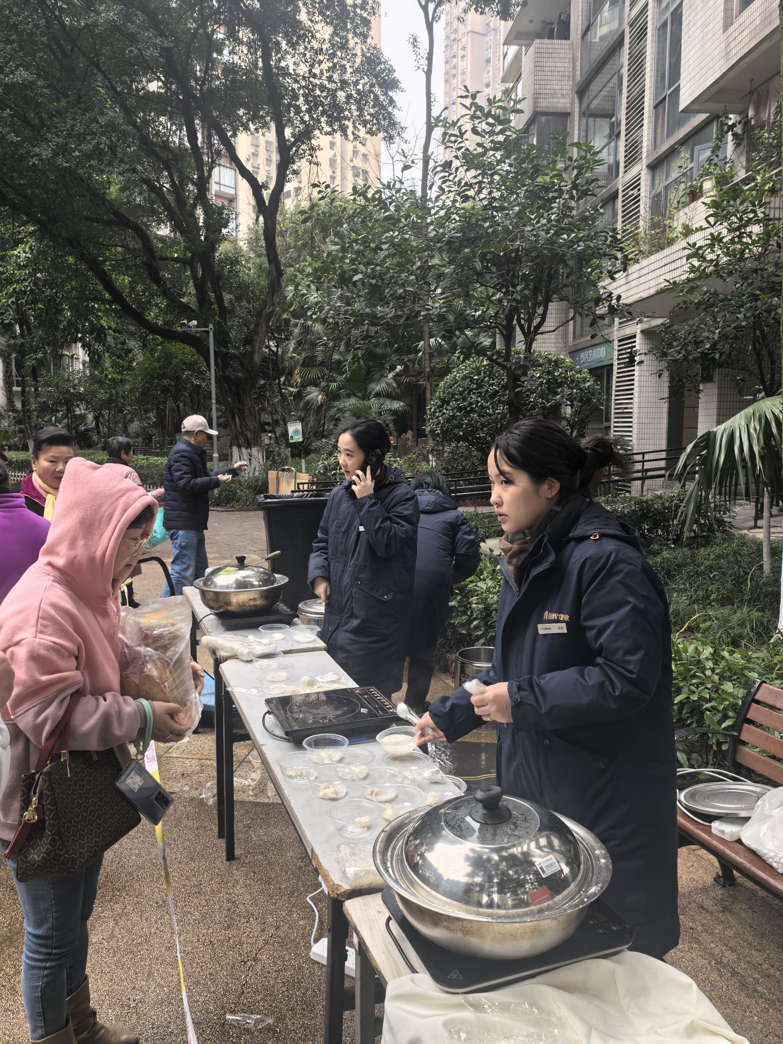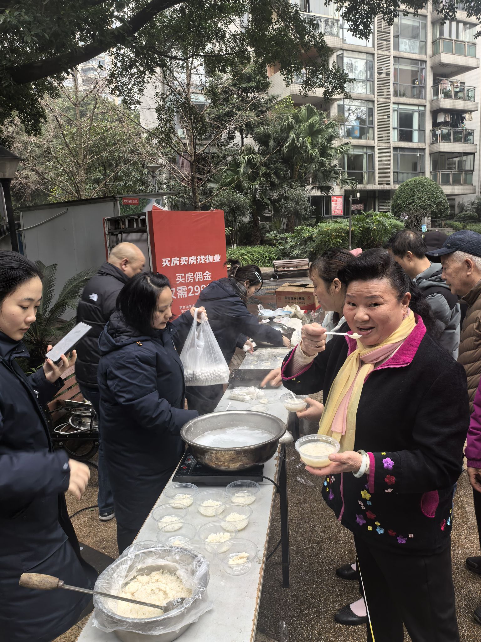 三臺電磁爐嗡嗡作響,火苗舔舐著鍋底,物業小王挽著袖子,手里的長勺攪得湯圓在鍋里打轉,嘴里的重慶話脆生生的:“叔叔阿姨快來吃碗醪糟湯圓,暖暖身子過冬至,冬至吃醪糟湯圓哎耶得板!”她的聲音穿透細雨,帶著山城人特有的熱辣與爽朗,惹得路過的業主紛紛駐足,不多時,隊伍便蜿蜒成了一條長龍。