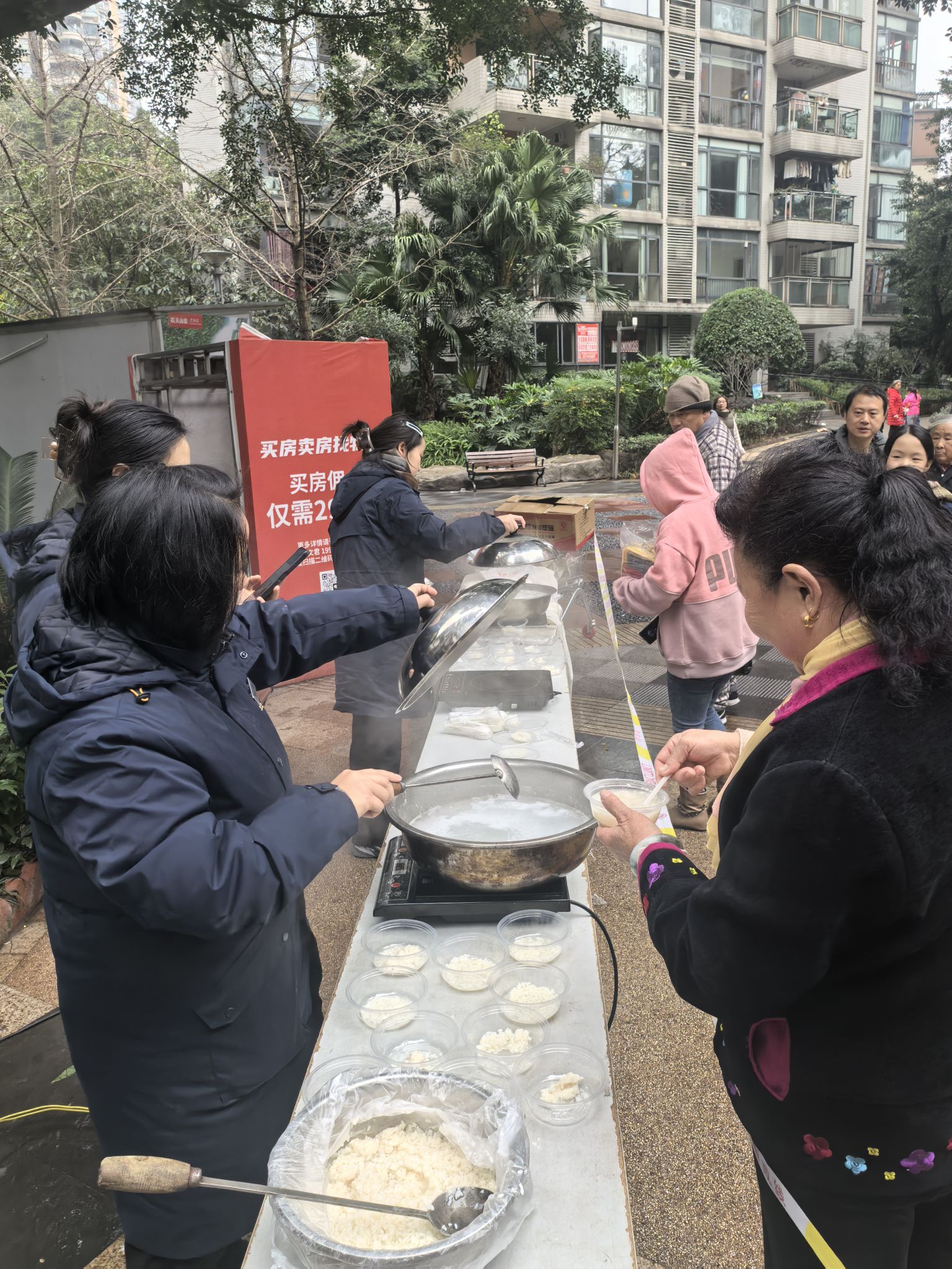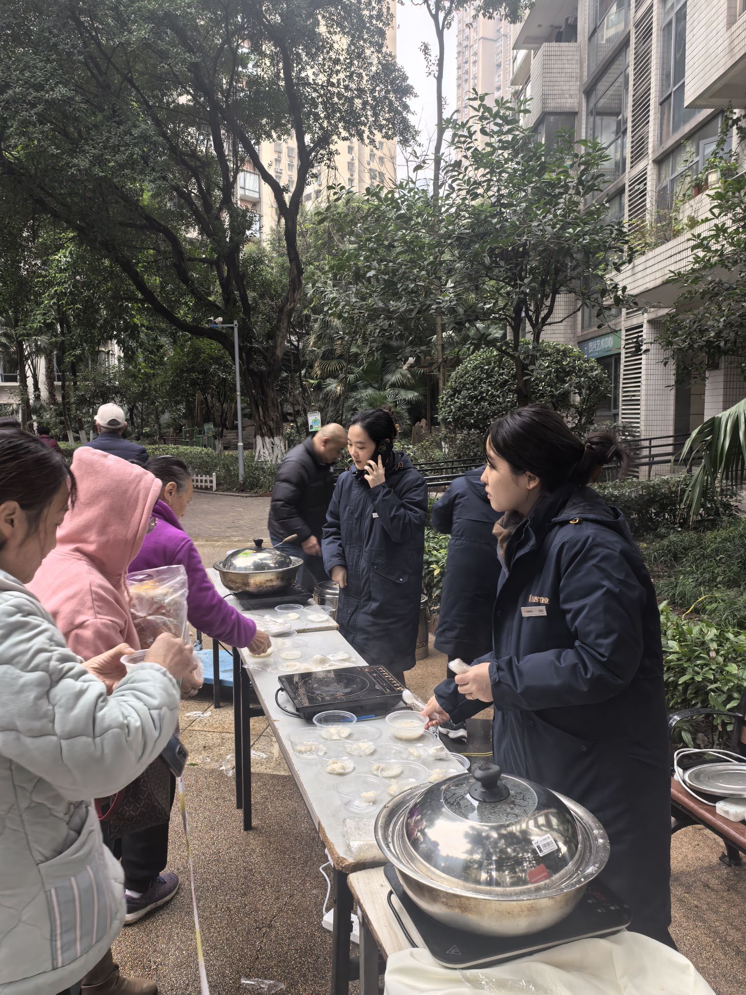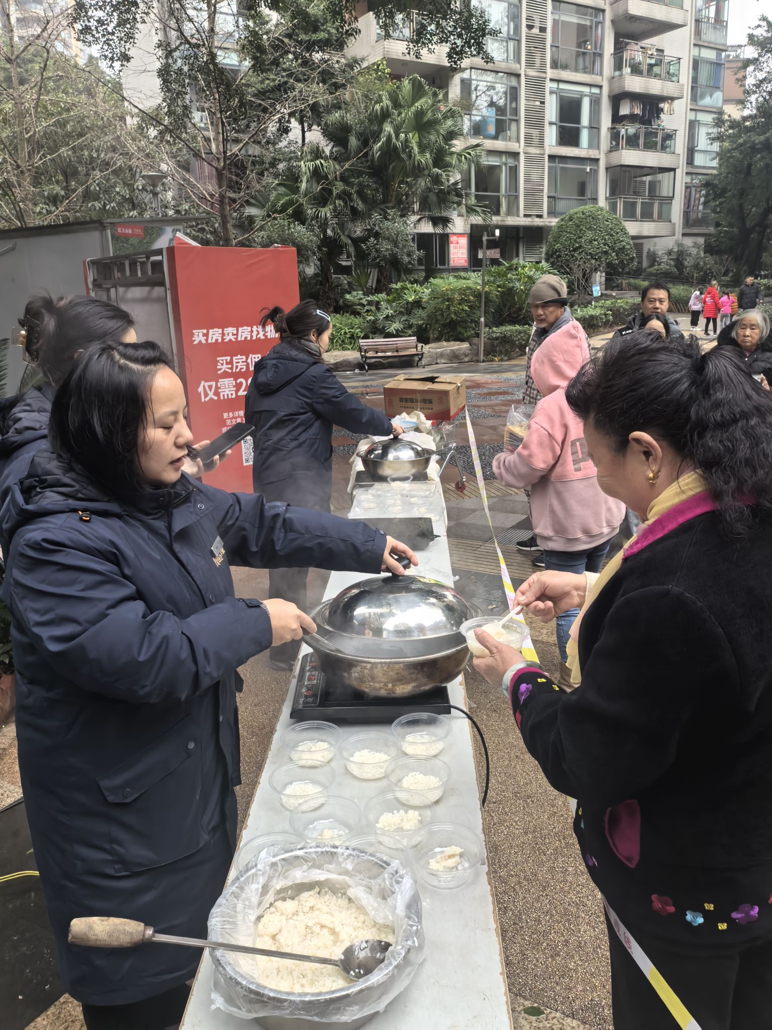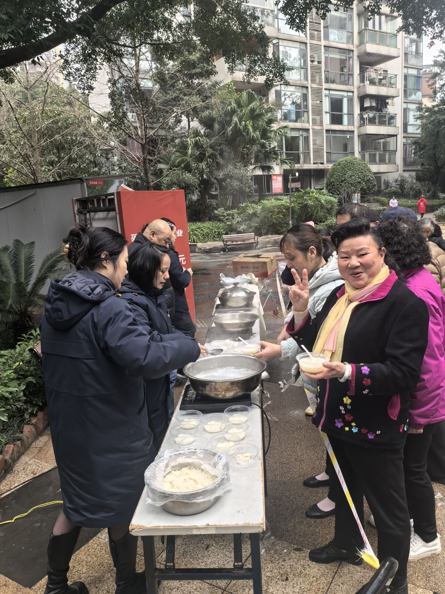 三臺電磁爐嗡嗡作響,火苗舔舐著鍋底,物業小王挽著袖子,手里的長勺攪得湯圓在鍋里打轉,嘴里的重慶話脆生生的:“叔叔阿姨快來吃碗醪糟湯圓,暖暖身子過冬至,冬至吃醪糟湯圓哎耶得板!”她的聲音穿透細雨,帶著山城人特有的熱辣與爽朗,惹得路過的業主紛紛駐足,不多時,隊伍便蜿蜒成了一條長龍。