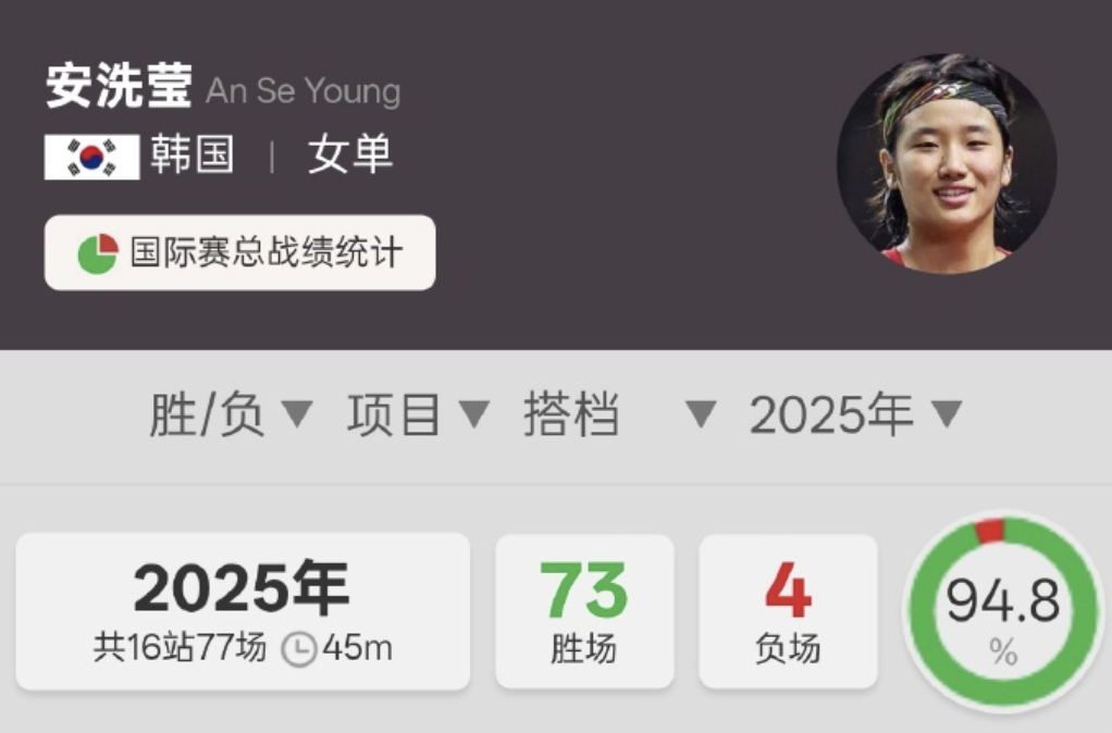 在2025年,安洗瑩幾乎不可阻擋。她單賽季拿下了11個(gè)冠軍,追平了桃田賢斗此前創(chuàng)造的紀(jì)錄,成為女子項(xiàng)目的第一人。本賽季,安洗瑩的勝率高達(dá)94.8%,歷史最高,對(duì)應(yīng)戰(zhàn)績(jī)?yōu)榭植赖?3勝4負(fù)。