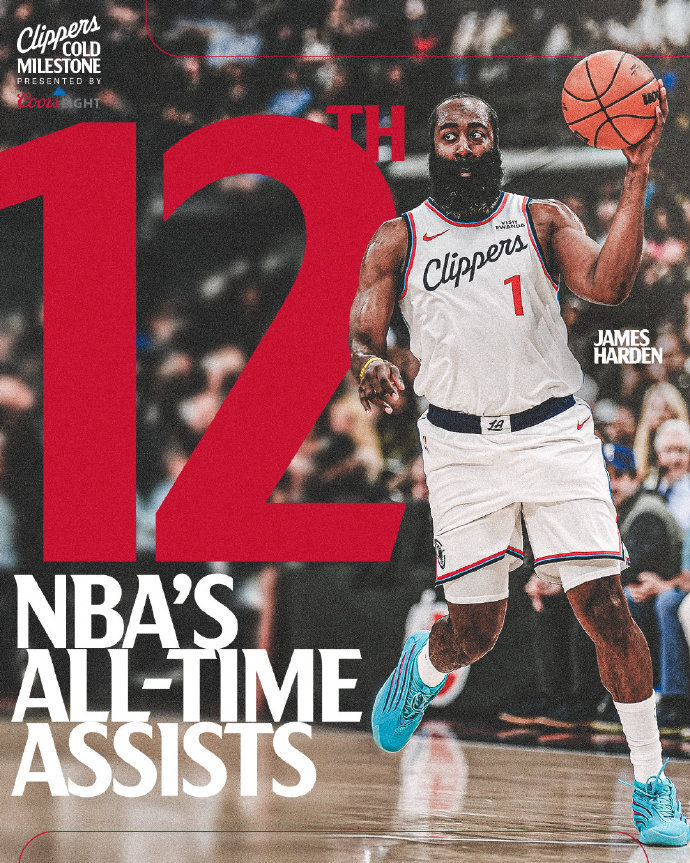 哈登生涯助攻數(shù)超越安德烈-米勒,正式升至NBA歷史助攻榜第12位。