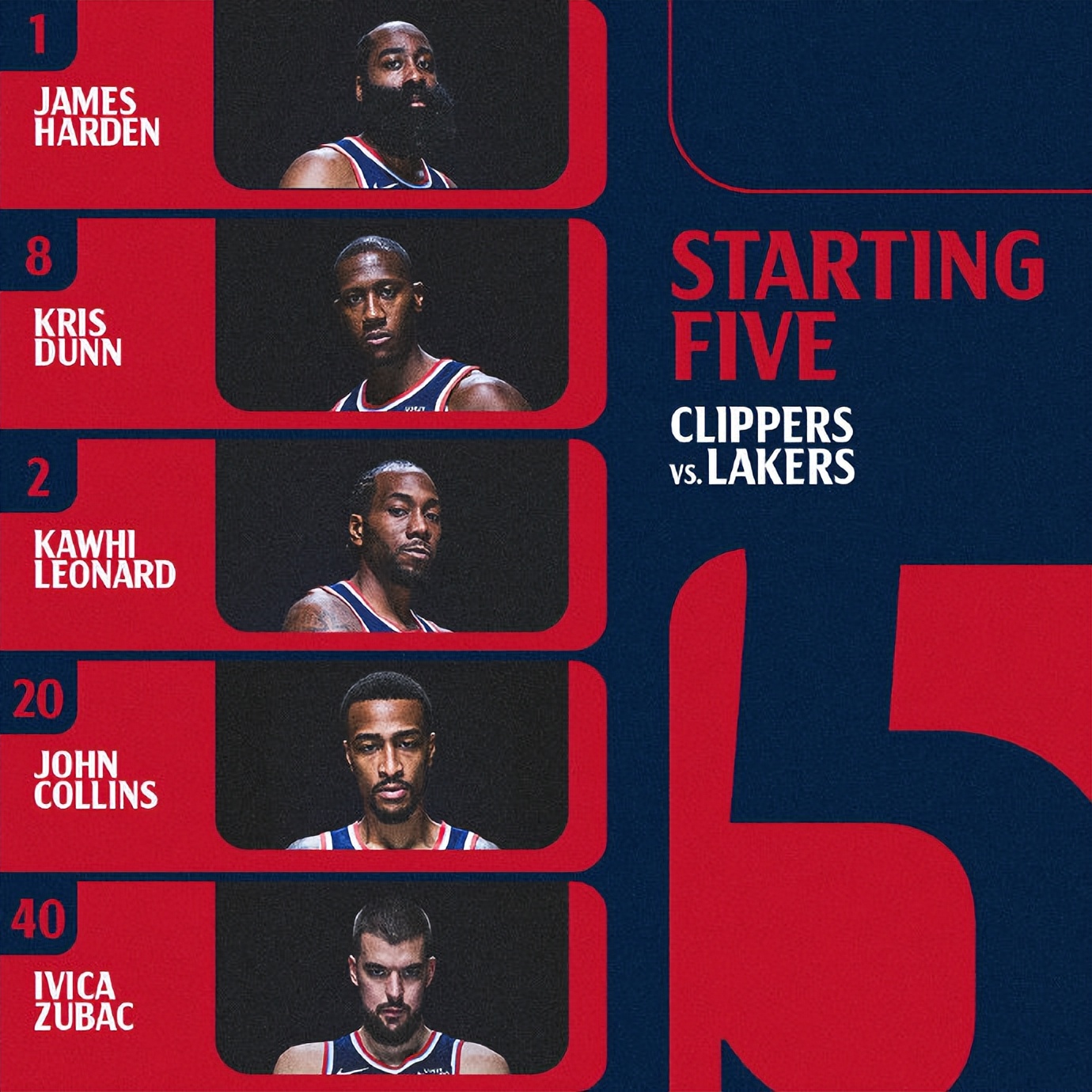 快船:萊昂納德、科林斯、祖巴茨、鄧恩、哈登