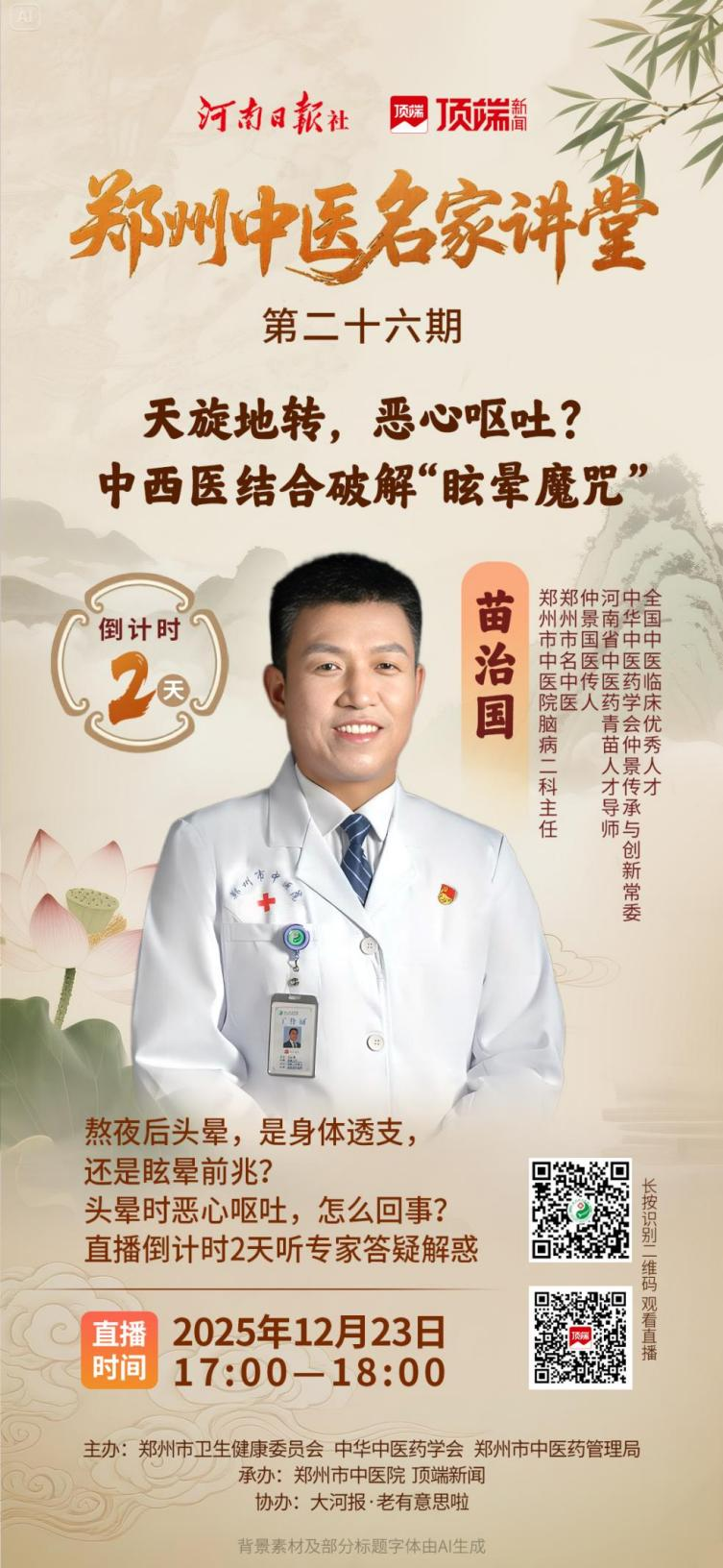 想知道容易引起眩暈的病因嗎?請鎖定第26期鄭州中醫名家講堂直播間。